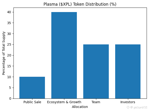The $XPL token is the core of Plasma’s security and incentive system. It is used for staking, validator rewards, and gas for advanced transactions. The initial supply at mainnet beta is 10 billion XPL. The distribution is designed to focus heavily on long-term ecosystem growth. Ten percent is allocated to the public sale, forty percent to ecosystem and growth, and the remaining fifty percent is split between team and investors with long-term vesting schedules. Plasma also plans to use an EIP-1559-style fee burn model, which helps balance emissions as network usage grows.