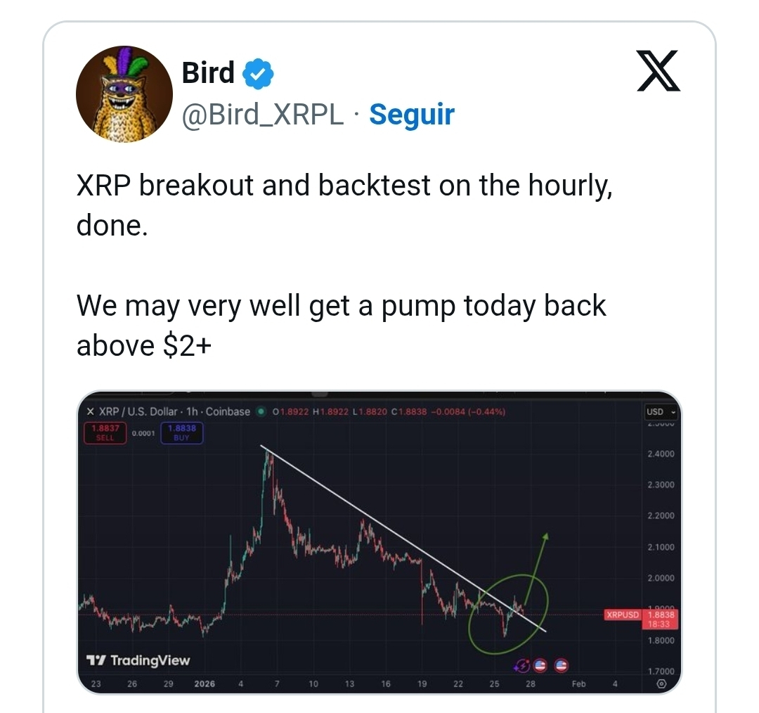 In einem aktuellen Beitrag auf X hat Bird (@Bird_XRPL) eine sich entwickelnde Aufwärtsstruktur im Stundenchart von XRP hervorgehoben und angedeutet, dass der Markt sich möglicherweise auf eine Rückkehr über die Marke von 2,00 US-Dollar vorbereitet. Anstatt sich auf Spekulationen zu konzentrieren, wies Bird auf eine spezifische Ausbruchs- und Retestformation hin, die Händler häufig als Bestätigungssignal interpretieren.