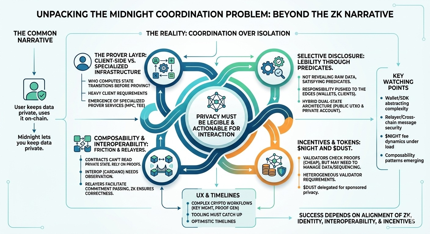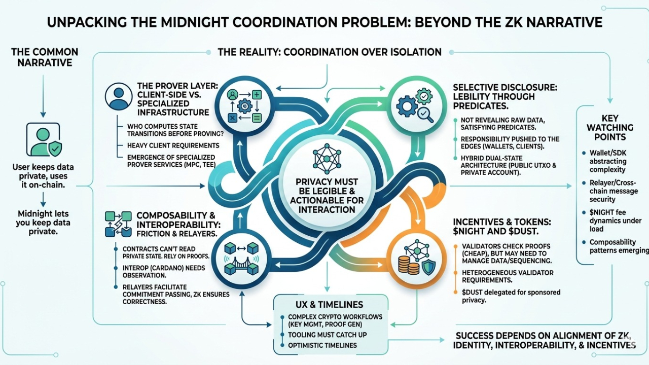 Been going through midnight again and… i think i initially underestimated how much of this design is really about coordination, not just privacy. the zk angle is obvious, but what caught my attention more is how many assumptions the system makes about actors behaving correctly around hidden data.