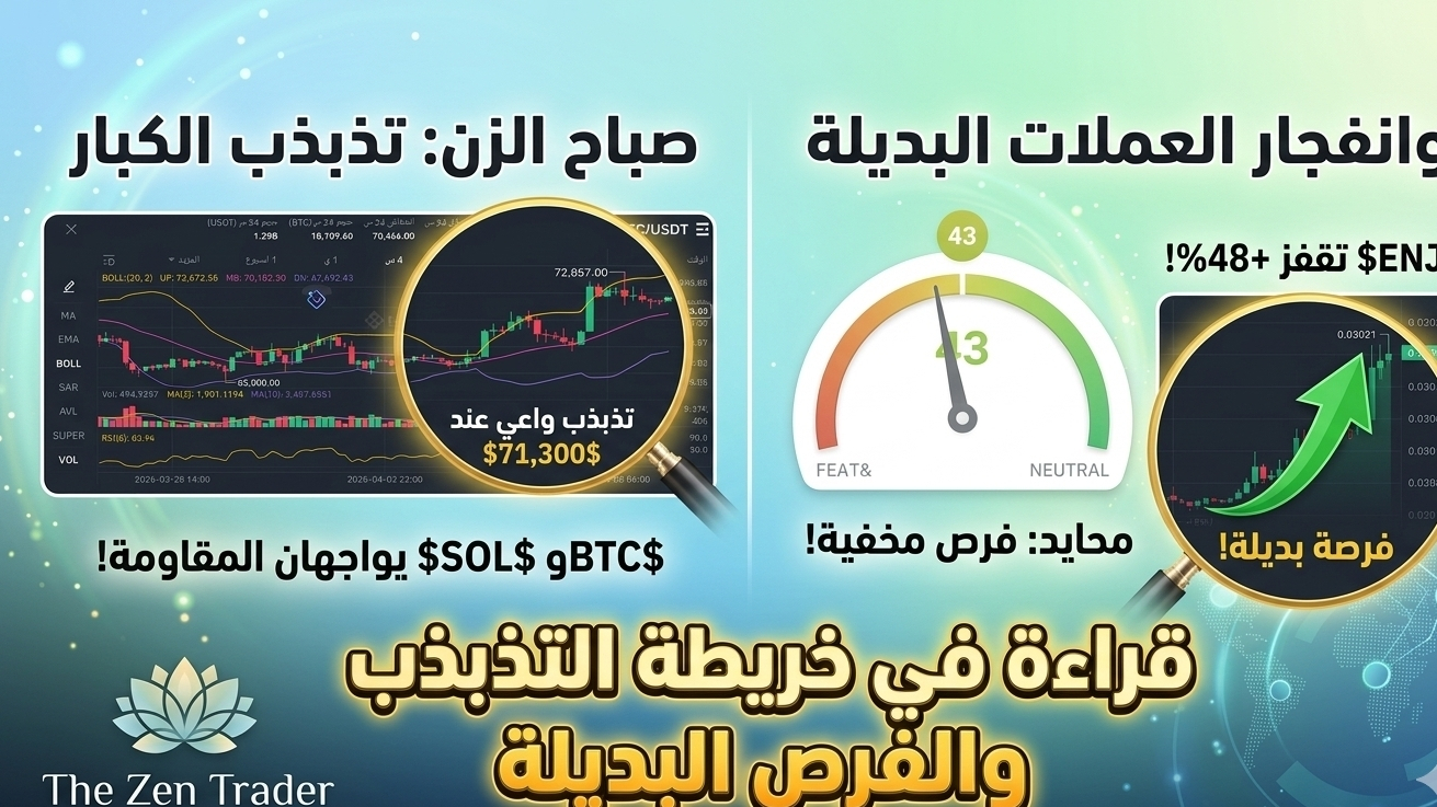 يستقر مؤشر الخوف والطمع عند مستوى 43 (محايد). في لغة الزن، هذا يعني أن المتداولين في حالة "انتظار وترقب"؛ فلا اندفاع شرائي جنوني ولا هلع بيعي، وهي البيئة المثالية لاقتناص الفرص الهادئة.