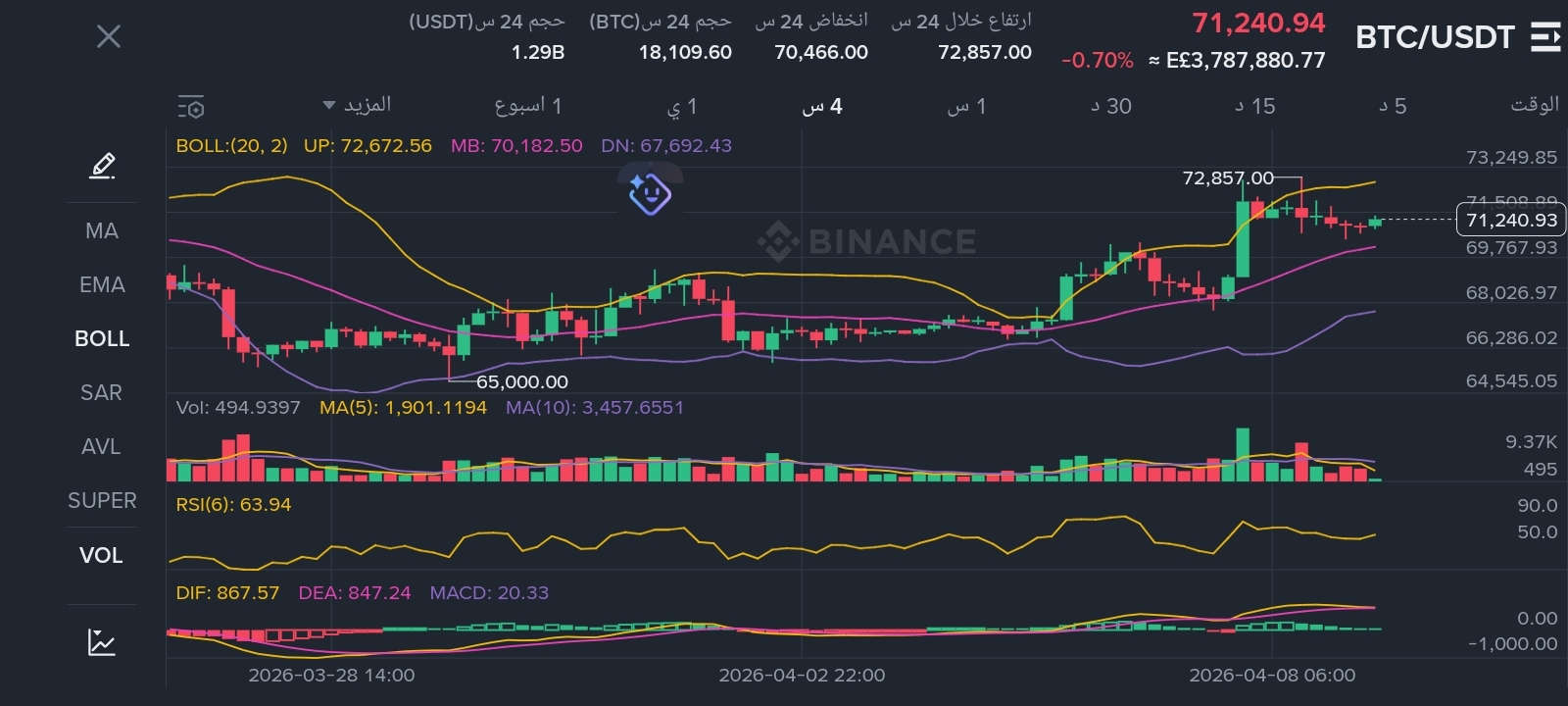 فنياً: نلاحظ ضيقاً في مؤشر البولنجر (BOLL) على فريم الـ 4 ساعات، مما يعني أننا نقترب من منطقة "انفجار سعري" قادمة فور تحديد الاتجاه.