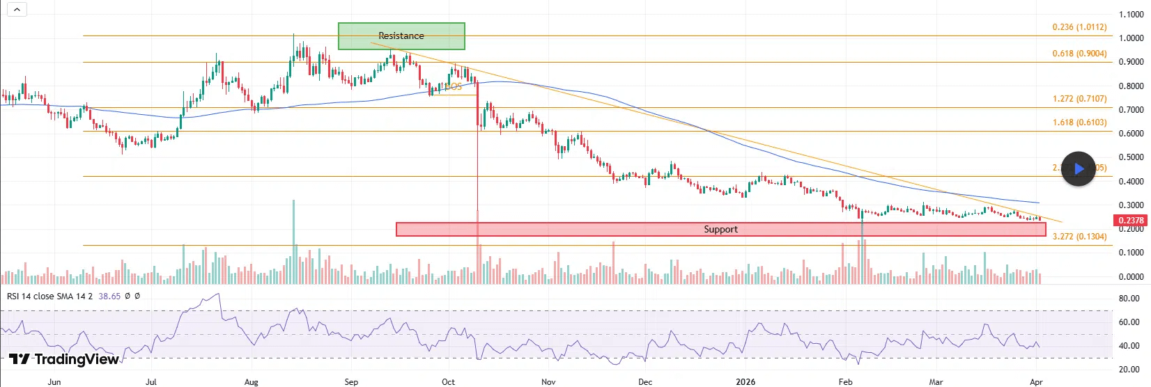 After peaking at $1.019 in August 2025, the coin has steadily dropped, recording declines in every month since. It has fallen by 75% from that peak, demonstrating the strong bear dominance that characterizes bear markets. This type of structure has weighed heavily on sentiment, gradually eroding confidence as repeated recovery attempts have stalled.