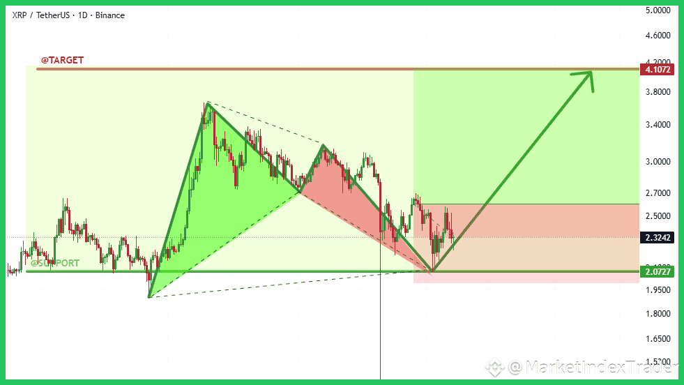 The XRP/USDT Daily chart has successfully completed a major bullish harmonic reversal pattern, testing and confirming the critical support zone near $2.07. The price is currently stabilizing around $2.32. Key resistance to watch for confirmation of the move is the zone between $2.50 and $2.60. A clean break and hold above this level will likely launch the price toward the pattern's ultimate measured target of $4.10.