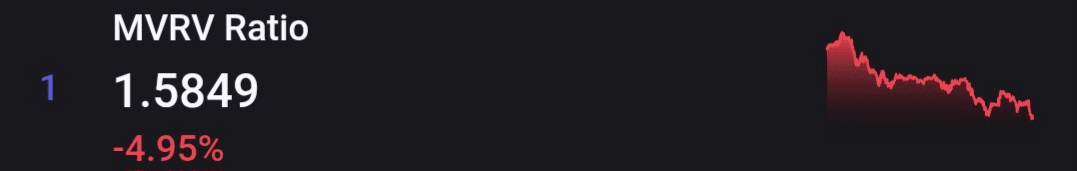 This, roughly speaking, compares the current market capitalization of Bitcoin with how much money has been invested in it overall (realized capitalization). Simply put, it shows how "overheated" the market is. A high value may indicate that the asset is expensive and could start to be sold off, while a low value suggests it is undervalued. Here it is 1.58, meaning the current market value is 1.58 times higher than the "fair" value. The fact that it has dropped by almost 5% (-4.95%) indicates that the market is cooling off slightly or there have been profit-taking. For a beginner, this is a signal to be cautious.