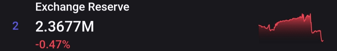 This is the total number of Bitcoins stored on all exchanges. This is a very important metric! If the number of Bitcoins on exchanges decreases, it is usually a good sign: people are withdrawing coins to their personal wallets for long-term storage. That means they do not intend to sell. If it increases, it means that coins are being brought to exchanges, and people are preparing to sell. In our screenshot, there is a slight decrease (-0.47%), indicating a slight outflow. This is a bullish (positive) signal.
