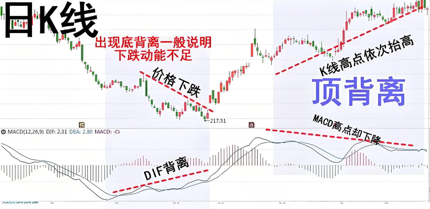 'Divergence' is a pattern that friends who often trade know well; it is composed of MACD and K-line prices, specifically characterized by: