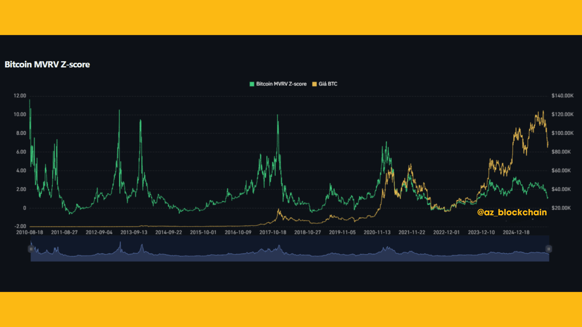 The MVRV Z-score chart is one of the strongest on-chain metrics to determine whether Bitcoin is undervalued, fairly valued, or overvalued. This is a particularly suitable indicator for newcomers because it directly reflects the overall market's profit and loss.