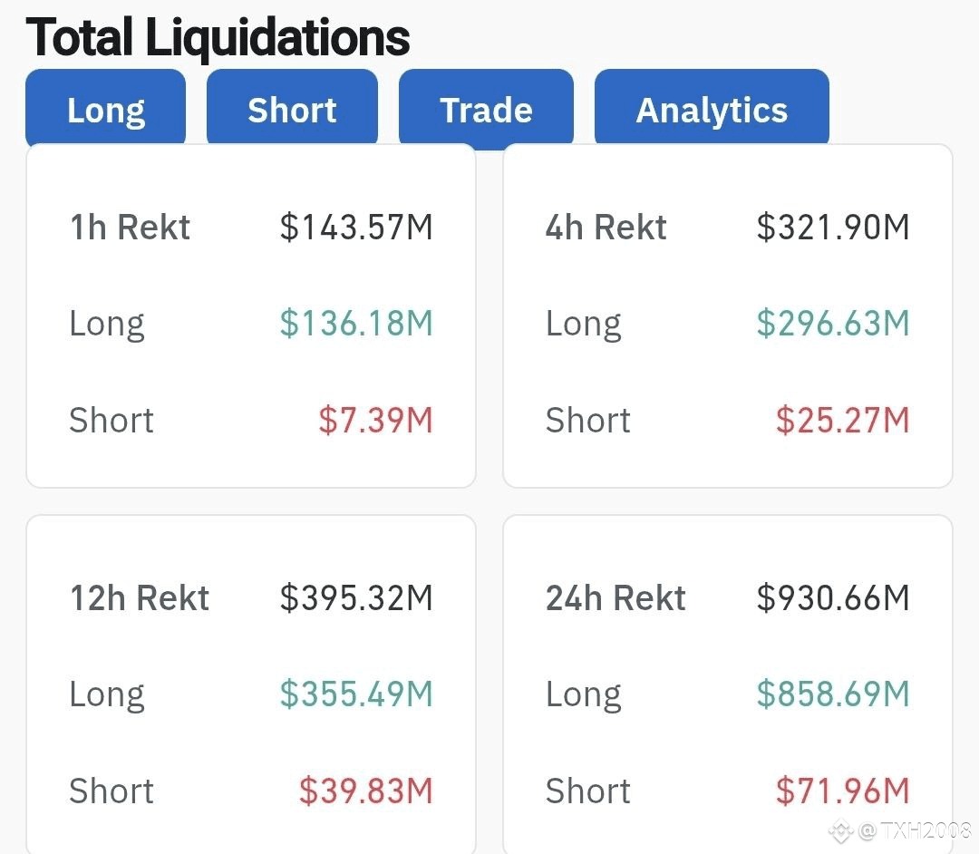 📢 In the last 24 hours, the cryptocurrency market has seen over $930 million worth of positions liquidated. This sharp wave of liquidations reflects heightened volatility across major assets as traders face rapid price swings, unexpected reversals, and increased leverage pressure. Both long and short positions were hit as liquidity thinned and market sentiment shifted quickly. This large-scale flush-out highlights how aggressive leverage can amplify market stress, reminding traders to stay cautious during high-volatility phases.