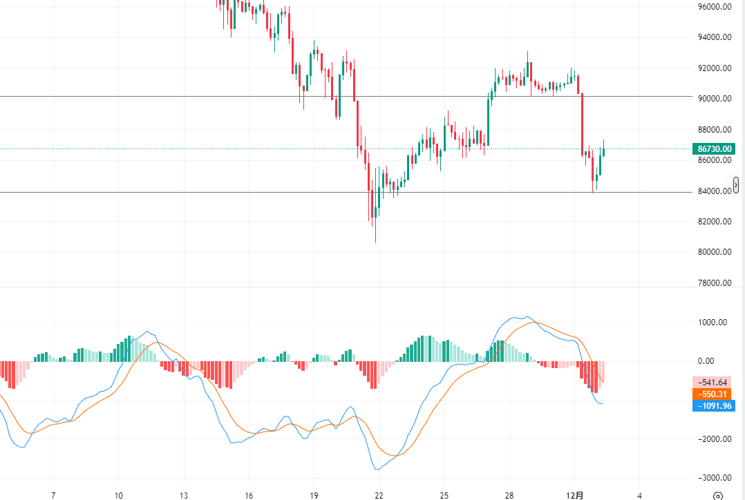 As of the morning of December 2, the market experienced a sharp rebound. Bitcoin rose back to around $87,000, and Ethereum also returned above $2,800. Observing from a smaller timeframe (like the 4-hour chart), signs of declining downward momentum have appeared, indicating a demand for technical correction in the short term. However, as the larger cycle indicators have turned bearish, and market sentiment is cautious, the strength of this rebound may be suppressed.