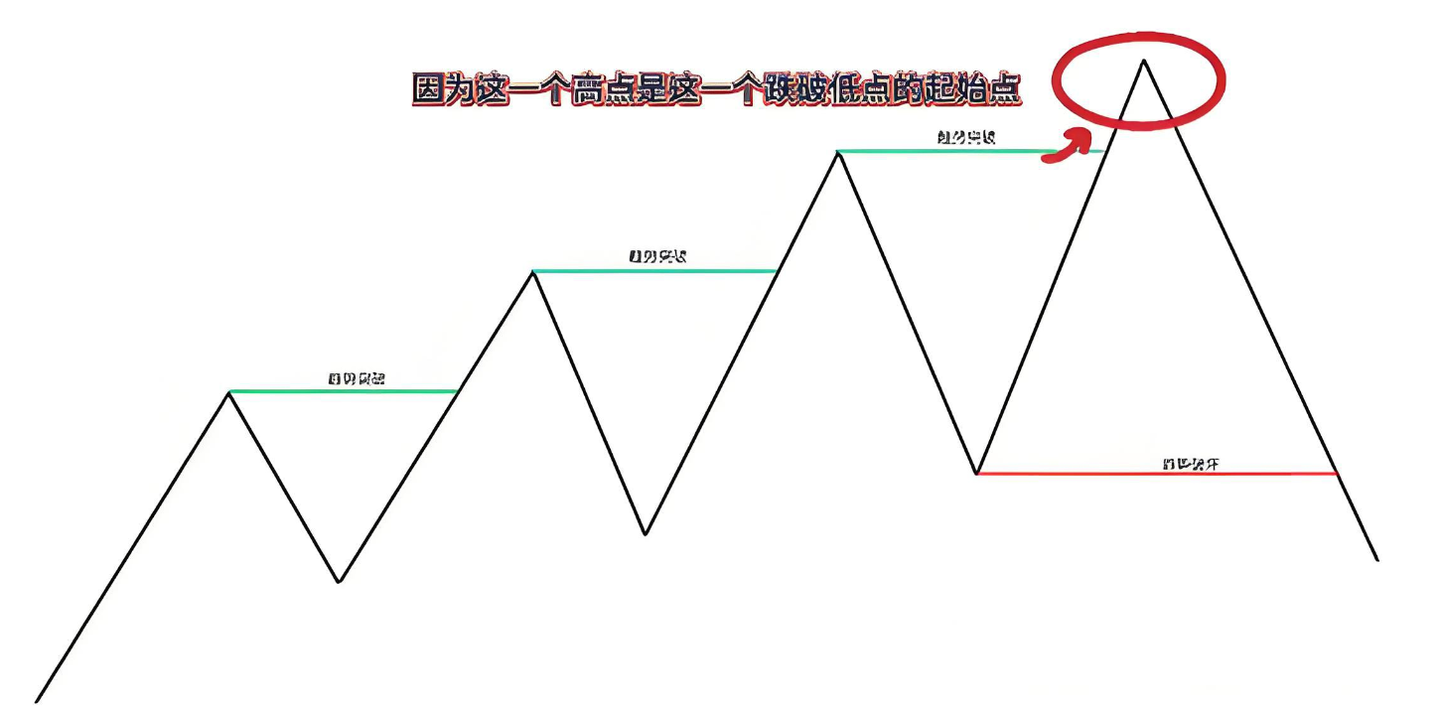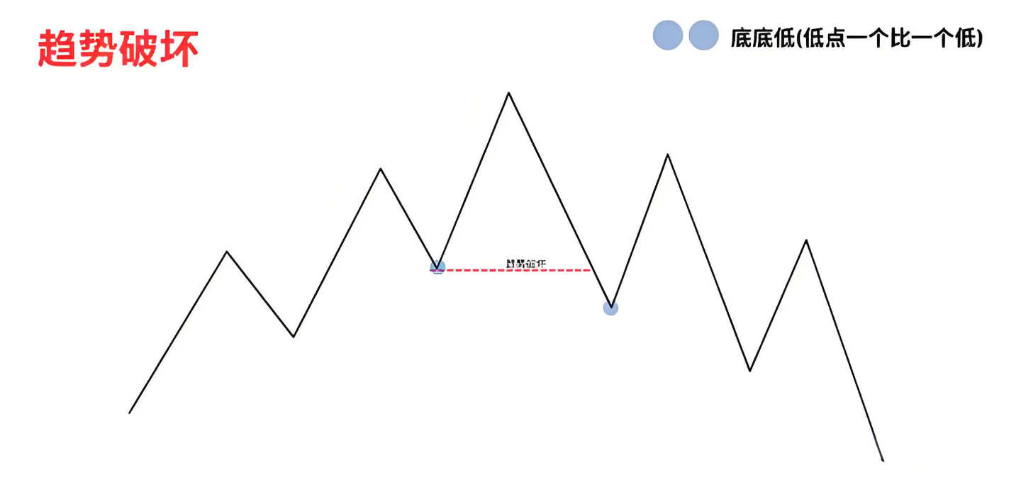 Uptrend broken: The price failed to make a new high and instead fell below the previous low, forming a "bottom-bottom-low" structure, indicating that the bullish momentum was exhausted and the uptrend was likely to end and reverse downward.
