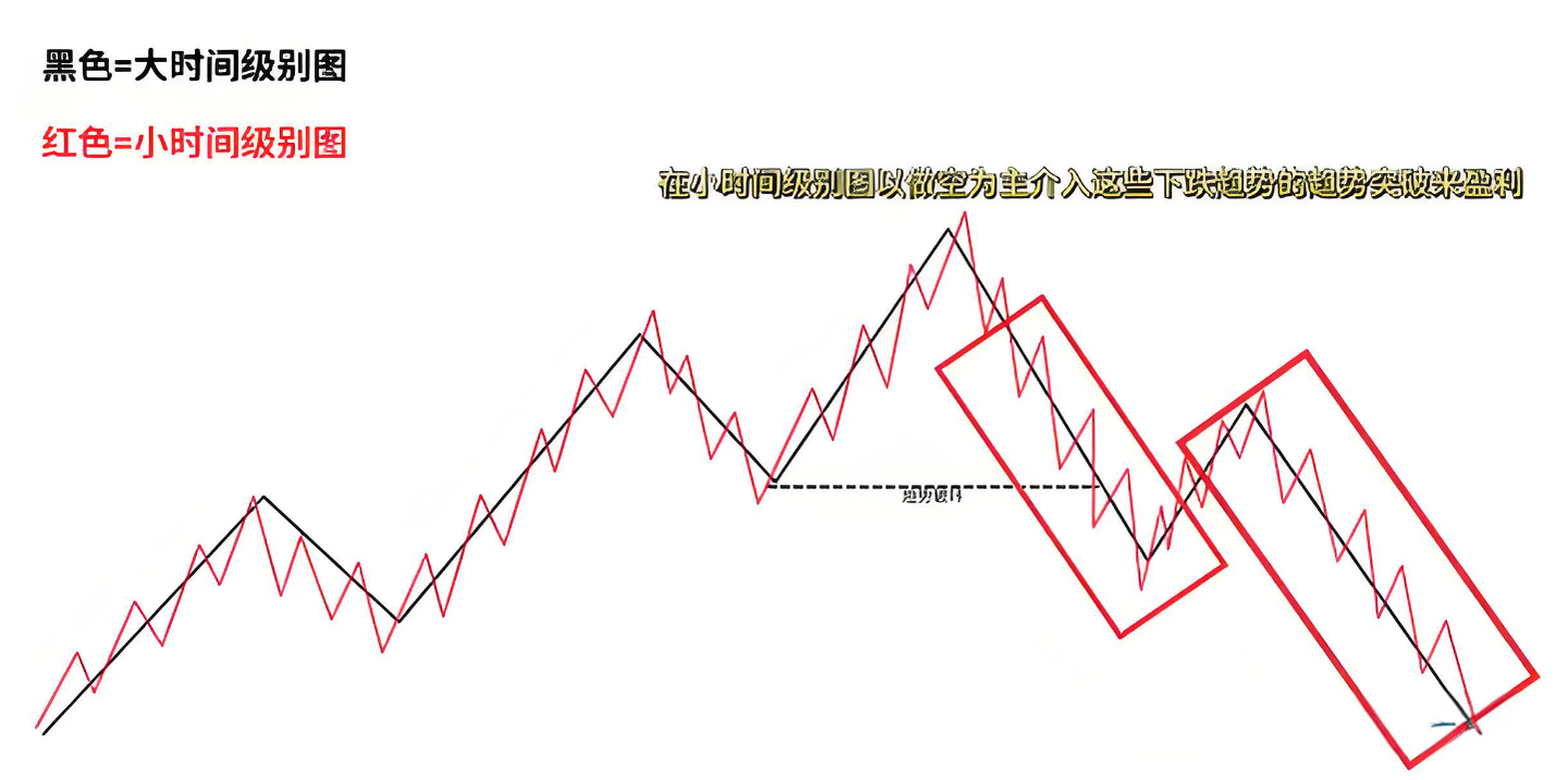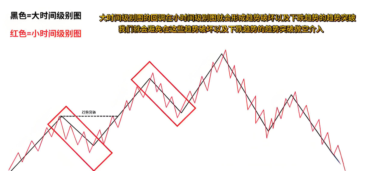 When a trend is broken in a larger timeframe (such as a shift from an upward to a downward trend), the smaller timeframe should also switch direction accordingly (shorting to short selling).