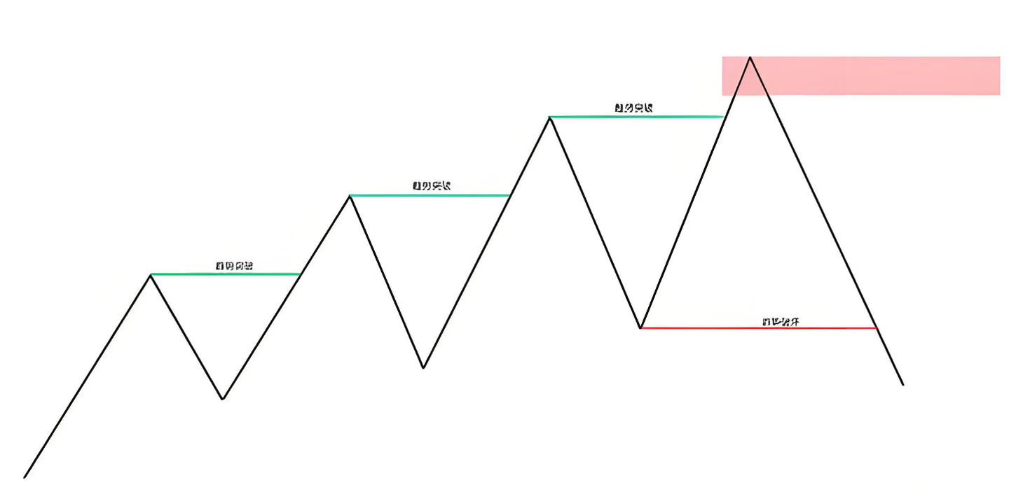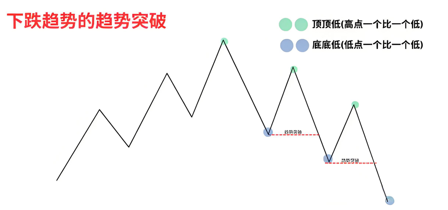 Downtrend broken: If the price fails to make a new low and instead breaks through the previous high, forming a "top-top-top" structure, it indicates that the bearish momentum has been exhausted and the downtrend is likely to reverse.