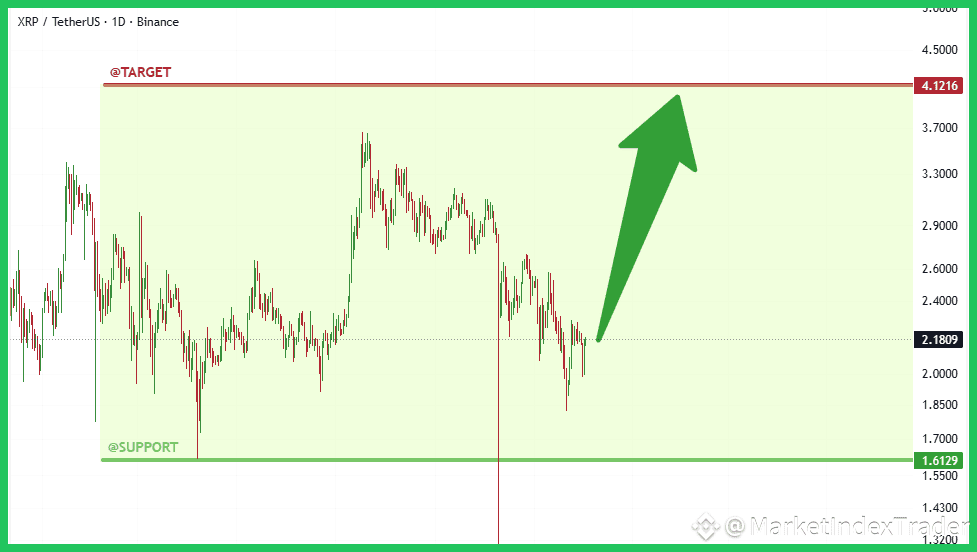 The Daily chart for $XRP/USDT confirms a strong bounce from the established long-term support zone at $1.61. This level has proven exceptionally resilient, suggesting massive accumulation is taking place. The current price action around $2.18 needs to consolidate before challenging overhead resistance. If current momentum holds, the ultimate technical target derived from this macro setup remains the major historical high at $4.1216.