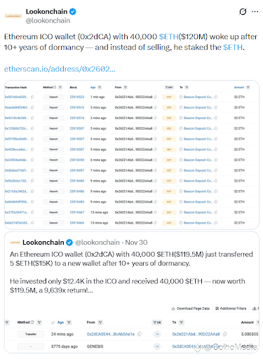 A wallet that received 40,000 ETH during the Ethereum ICO in 2015 (worth $12,000 at the time) has now converted its entire balance to staking, valued at over $120 million. Instead of selling, the whale chose to secure the network long-term through staking, a move many see as a strong sign of confidence in the future of cryptocurrencies.