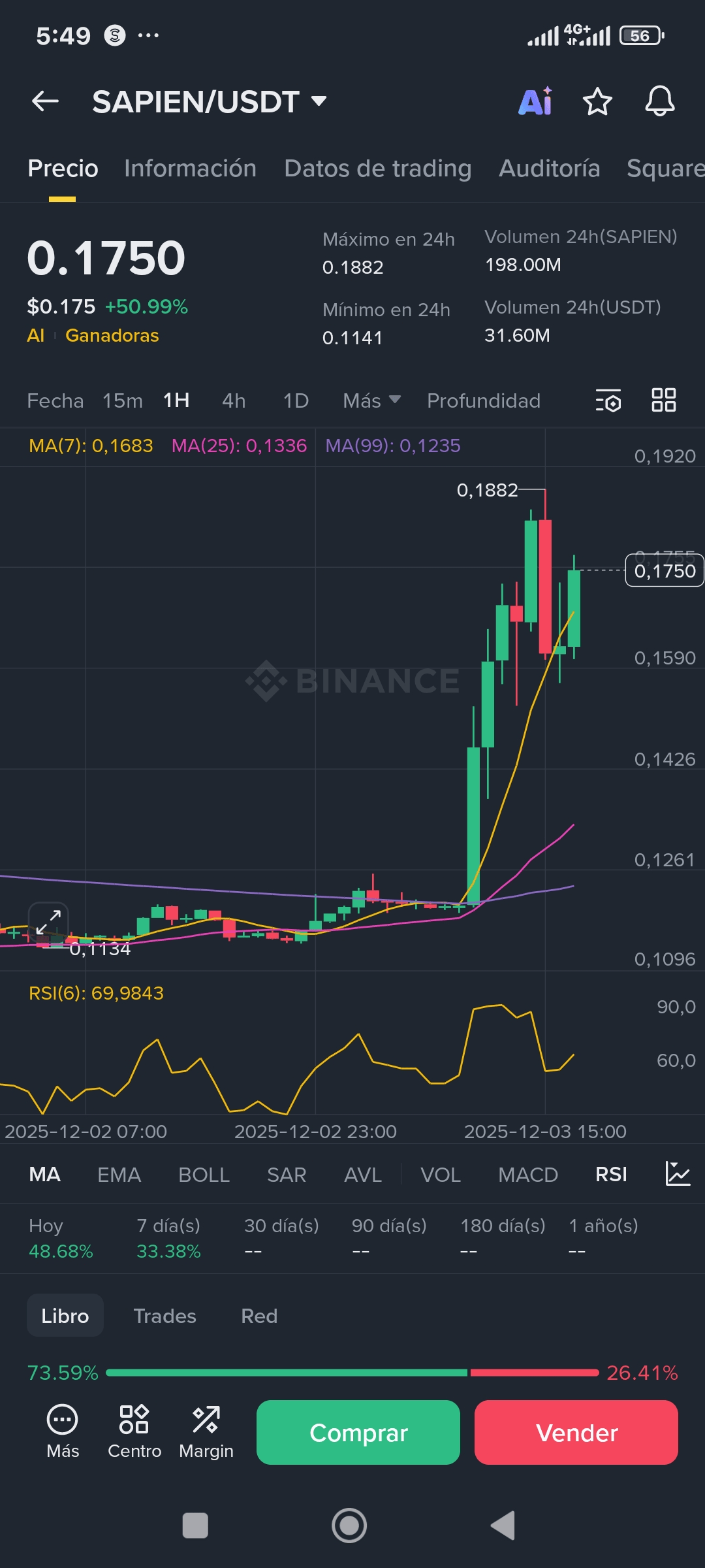 The pair $SAPIEN /USDT is experiencing a strong and confirmed bullish trend, with a gain of over +50% in 24 hours and trading at $0.1750.