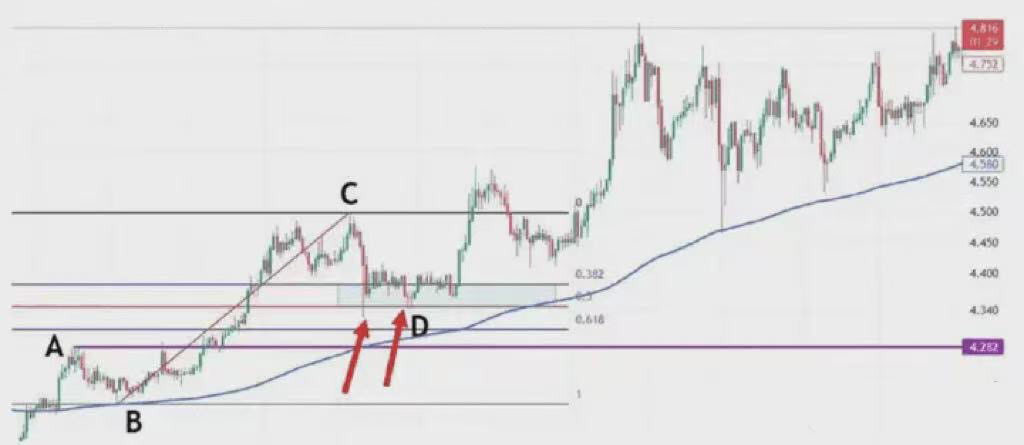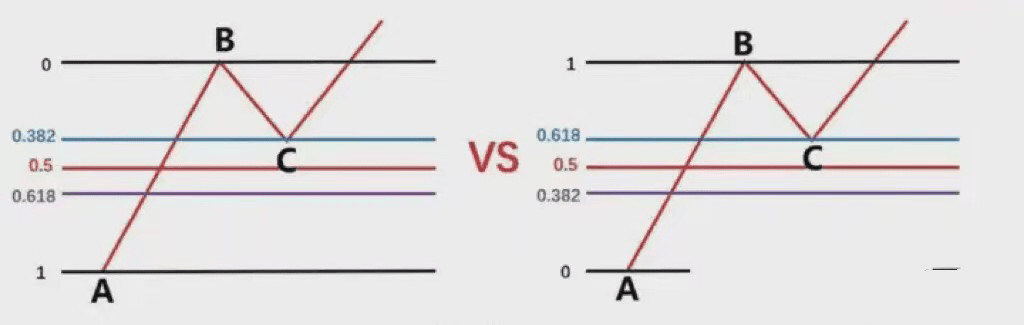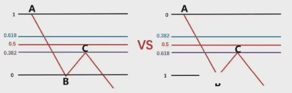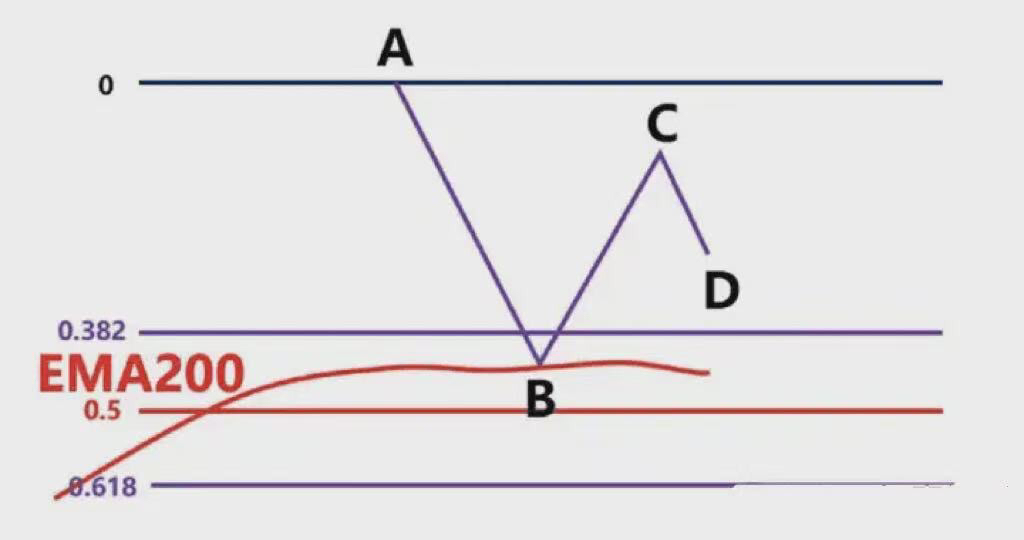 First, we cannot directly connect B and C as the high and low points of the wave and then draw Fibonacci retracements. If the price falls from high point C to point D, at point D, it could either rise or fall; let's assume it falls. Then we need to draw Fibonacci retracements based on the previous wave's high point A and low point, and then observe whether the area around point B corresponds to the 0.382-0.618 Fibonacci retracement level.
