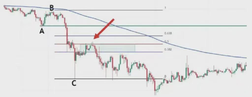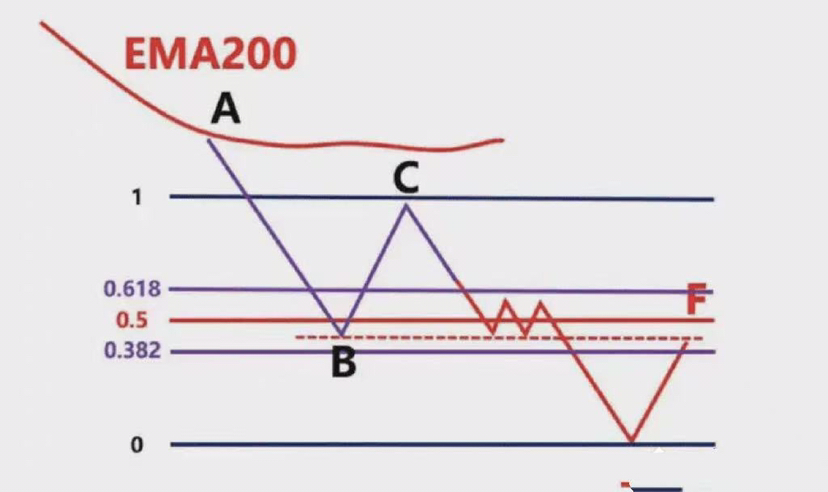 The blue line in the chart represents the EMA200. We see low point A and high point B. At this point, the price is below the EMA200, so we only short, not long. We draw a green horizontal support line based on low point A. We see the price subsequently break below A and reach low point C. We then draw the Fibonacci retracement levels based on high point B and low point C, and observe the price action when it returns to the 0.382-0.618 Fibonacci retracement level, represented by the light green area on the chart.