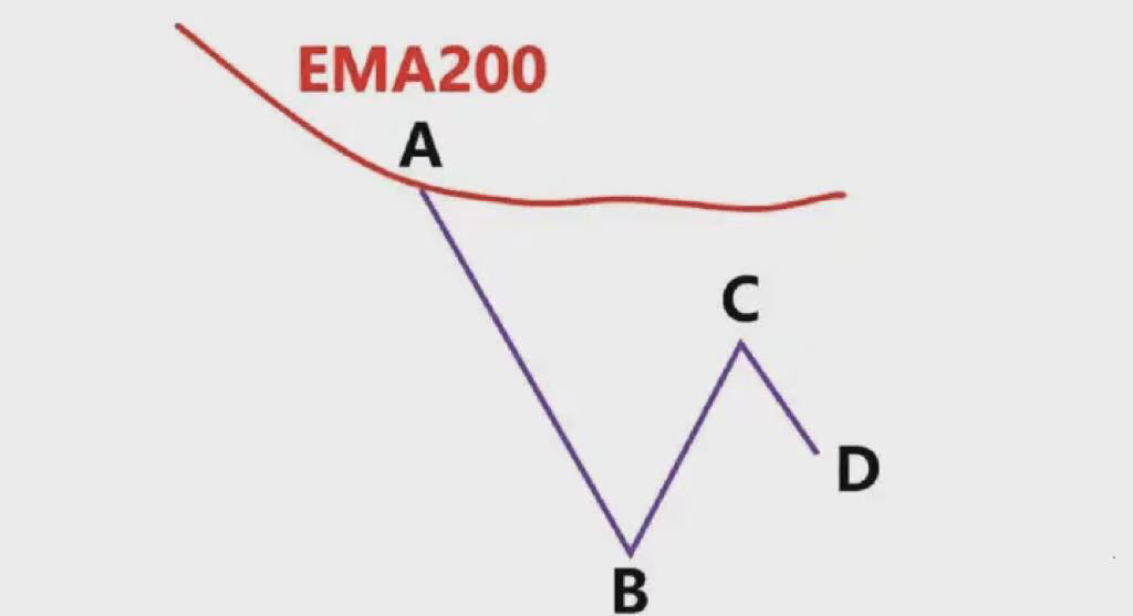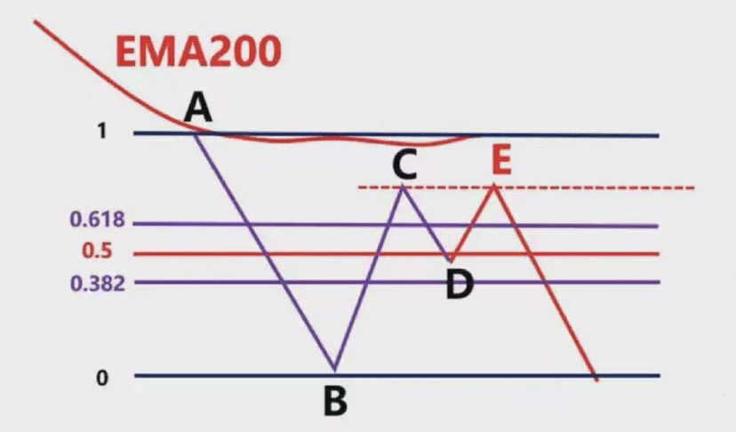 Because traders who went long at point D will take profits and close their positions at point E based on the principle that BC and DE are equidistant, the bullish momentum will be exhausted, the bears will continue to exert pressure, and the price will continue to fall. Of course, it is also possible that a three-stage rebound will form before continuing to fall, but as long as the trend is not broken, we should trade in the direction of the trend.