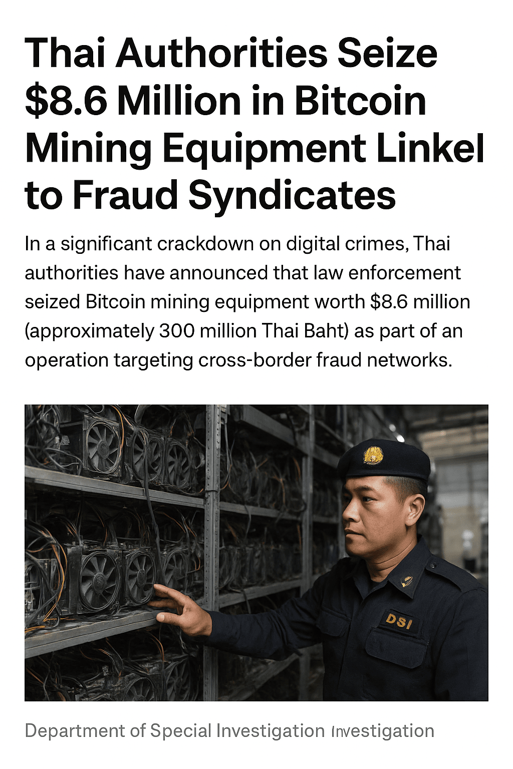 In a significant development in the fight against digital crimes, authorities in Thailand announced that law enforcement seized Bitcoin mining equipment valued at $8.6 million (approximately 300 million Thai Baht), as part of an operation targeting cross-border fraud networks.