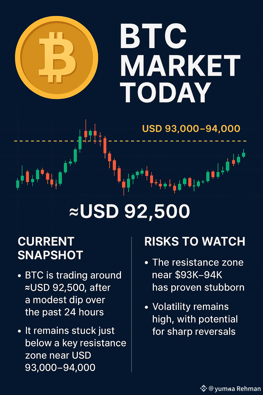 $BTC is trading around ≈ USD 92,500, after a modest dip over the past 24 hours.