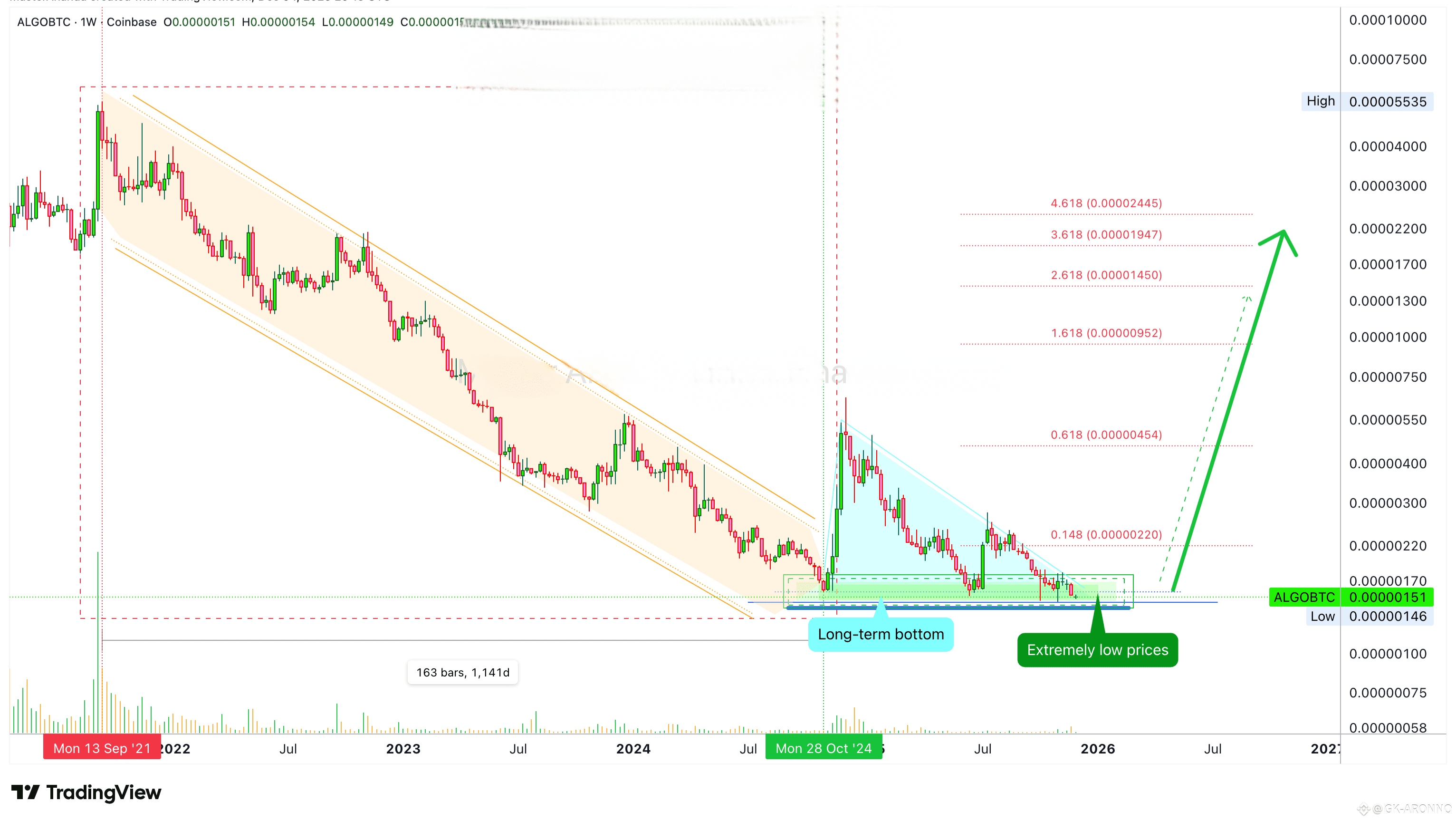 All gains from the initial bullish breakout were removed. ALGOBTC is back to baseline level, a total reset. The last bullish jump produced 300% total growth. This is the minimum we can get in this bullish wave. But it is different now.