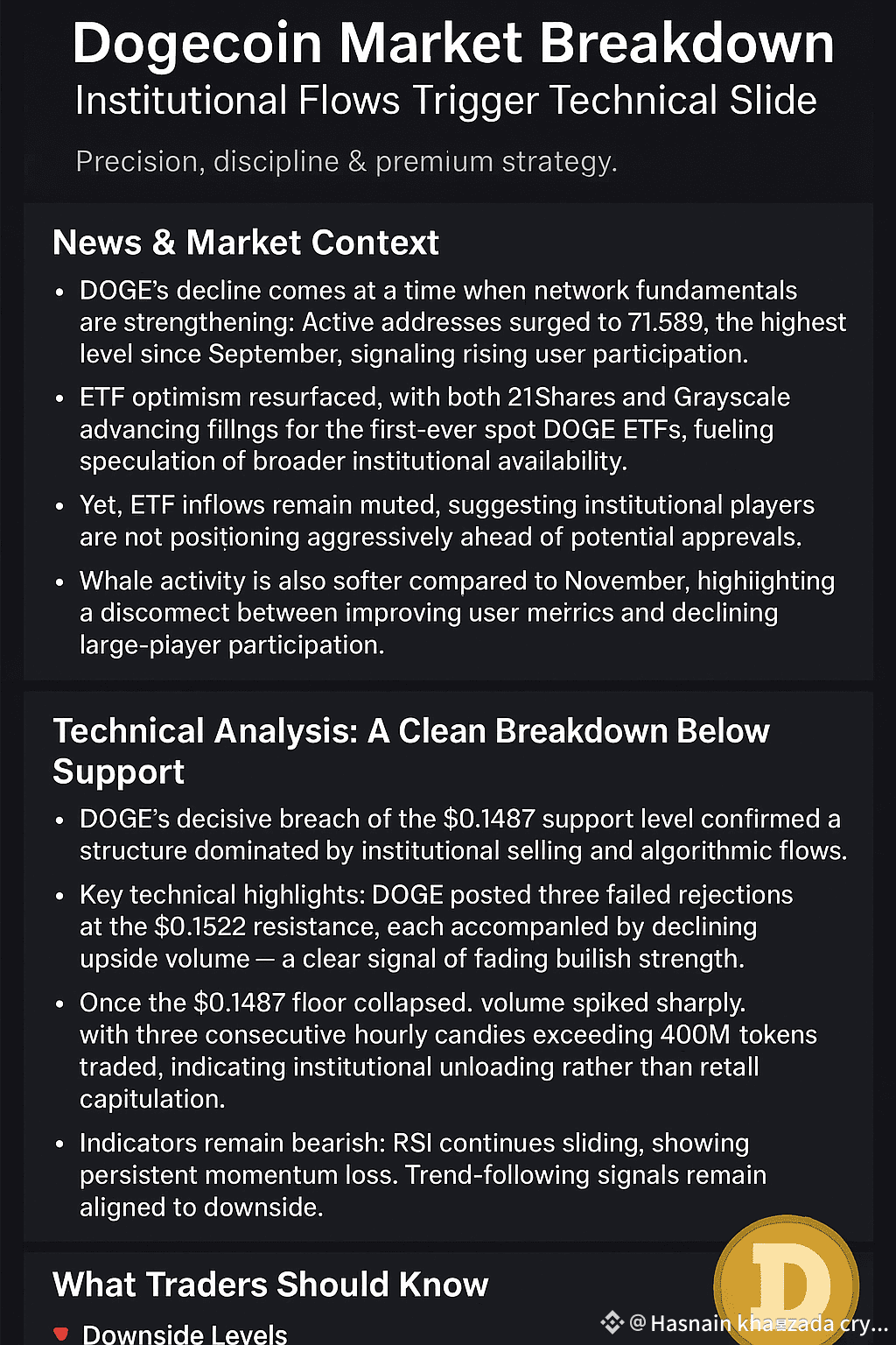 DOGE’s decisive breach of the $0.1487 support level confirmed a structure dominated by institutional selling and algorithmic flows.