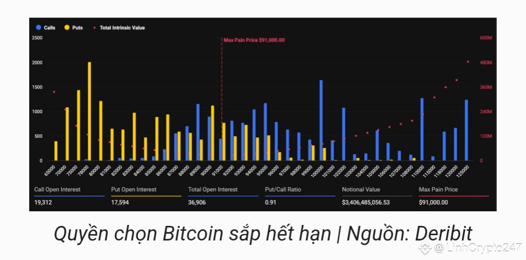 The maximum pain level for BTC is around $91,000, slightly below the current market price near $92,279.