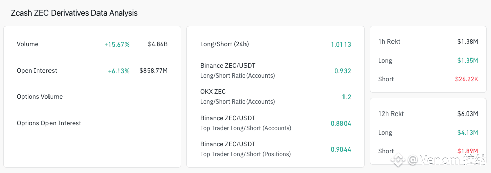 Coin Glass data shows Zcash open interest rose 6% mildly exceeding the 5% spot gains, showing that traders are backing spot purchases with healthy leverage, in anticipation of further upside. The long/short ratio flipped above 1.0 confirming that the fresh leverage positions were predominantly bullish on ZEC price.