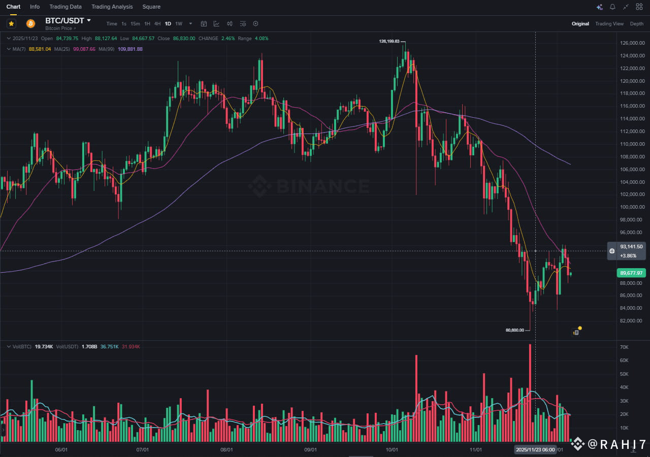 Bitcoin reached a major peak near $126,198 in late October, marking one of the strongest surges of the cycle. But after this rally, sellers stepped in aggressively, pushing the price into a deep correction phase.