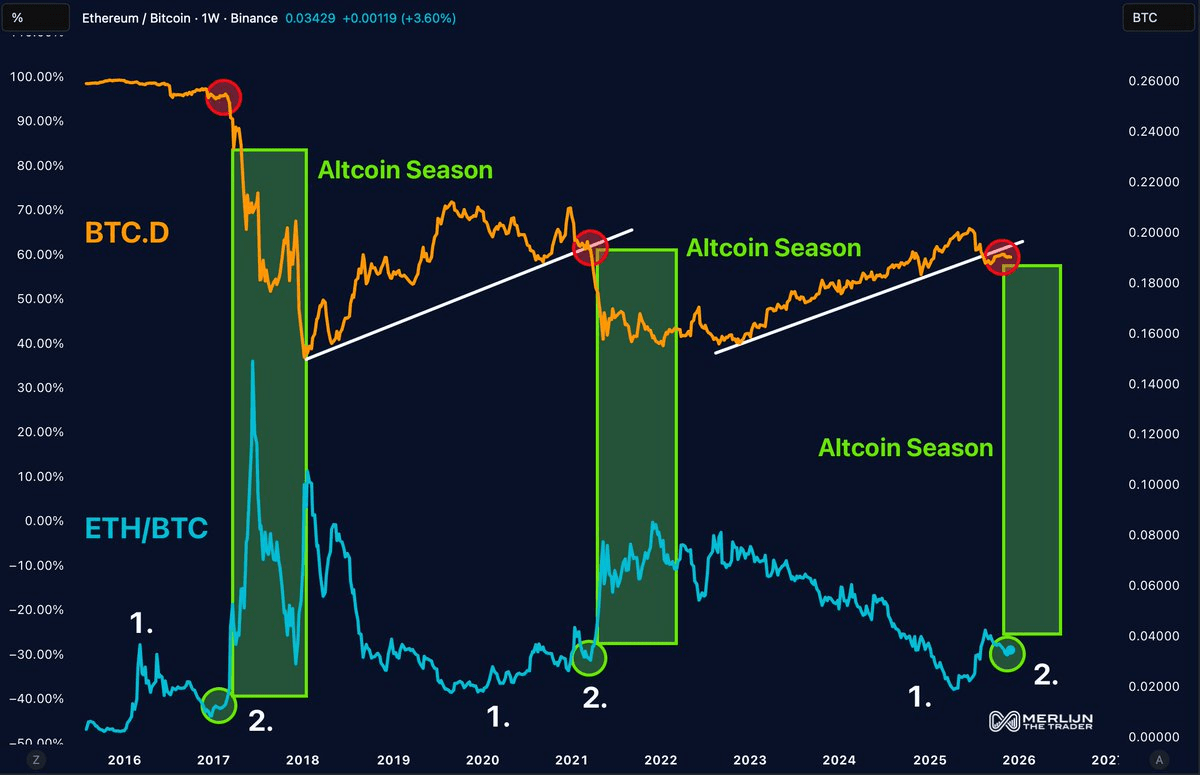 The chart identifies three altcoin seasons across three different market environments, each beginning with identical structural catalysts. The current setup, forming now ahead of 2026, closely mirrors previous phases. While nothing is guaranteed in markets, the coincidence of Bitcoin's dominance breakdown and the ETH/BTC reversal is an uncommon mix, which has historically preceded explosive altcoin performance.