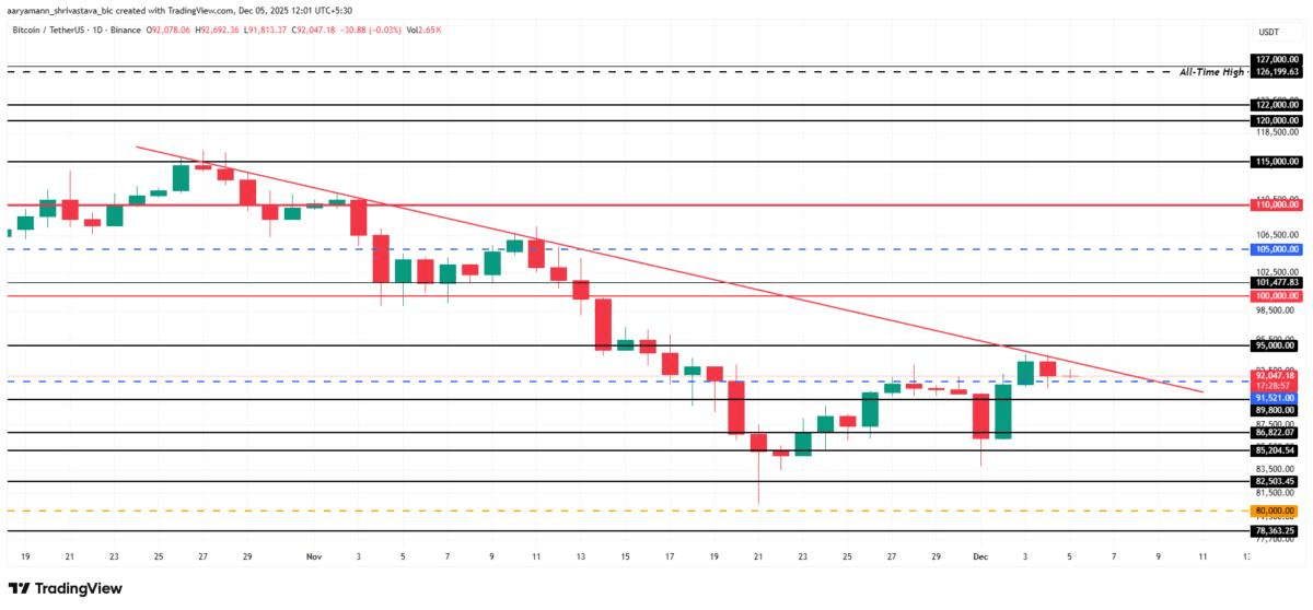 Currently, Bitcoin is trading at $92,047. The price is held above the critical support level of $91,521. Meanwhile, the asset remains trapped within a monthly downtrend. A decisive breakout is required to exit the current position, which has not yet occurred, despite recent attempts.