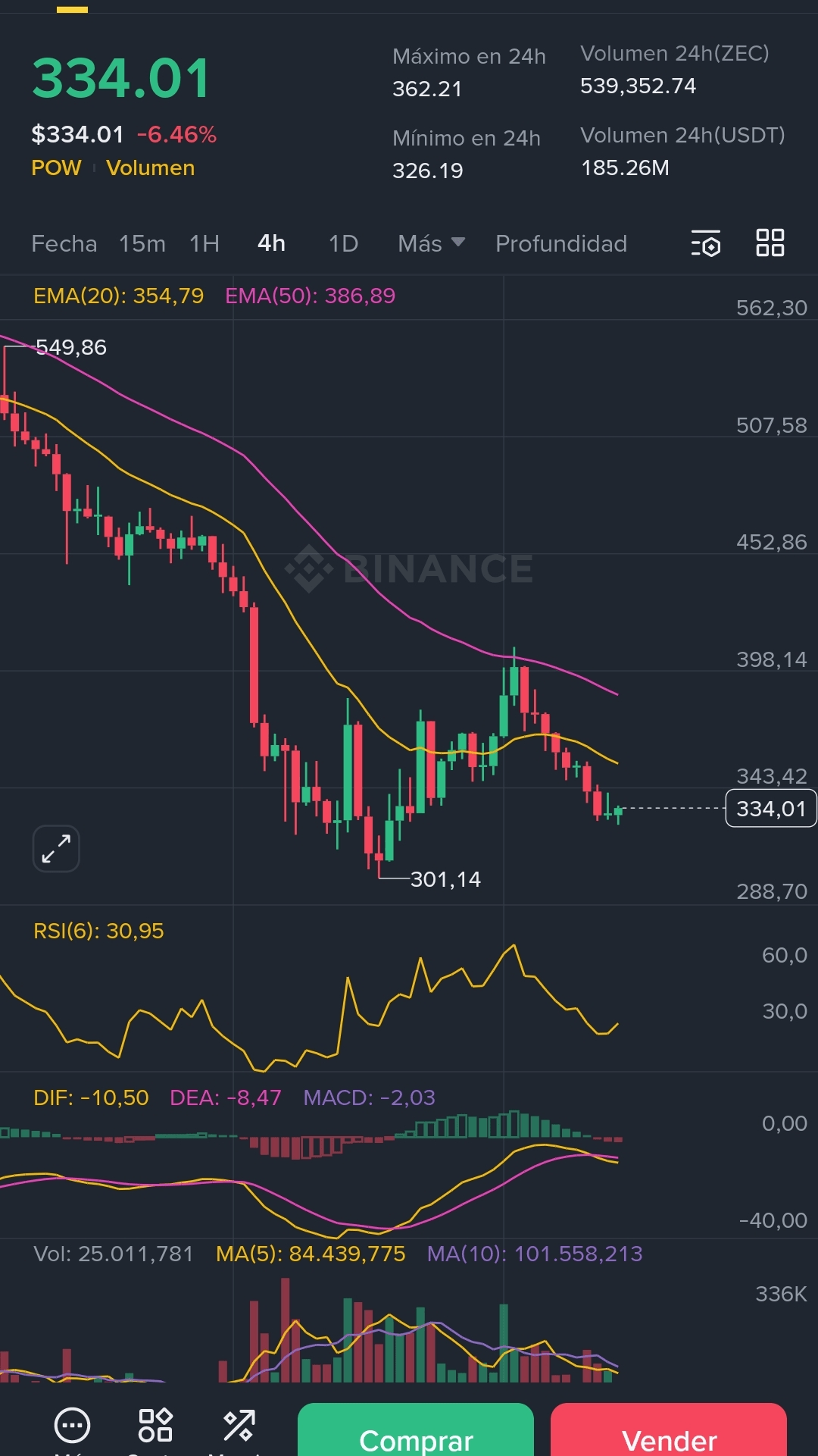 In summary: $ZEC is under intense selling pressure. The trend is clearly bearish and the price is seeking support near the minimum of 301.14.