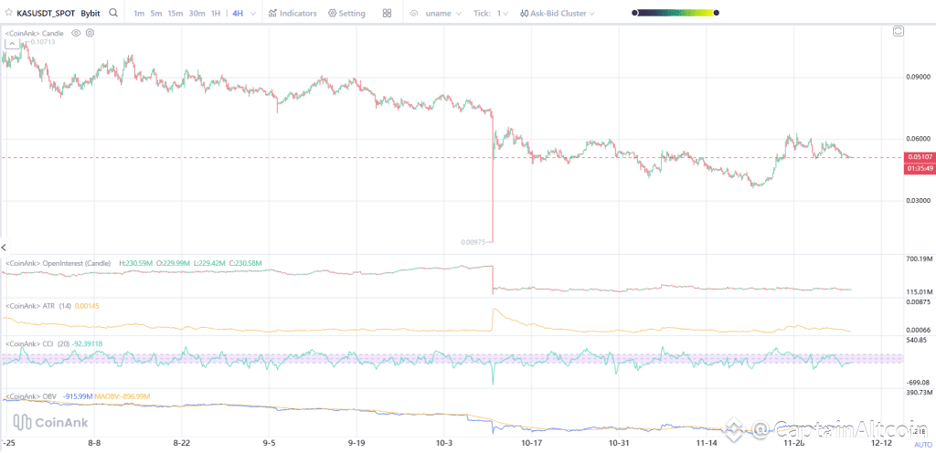 The strongest move on the chart is the sharp drop in early October, when KAS briefly flushed toward $0.0097 before recovering. That liquidation spike created a temporary bottom, but the recovery stalled around $0.06 before fading again.