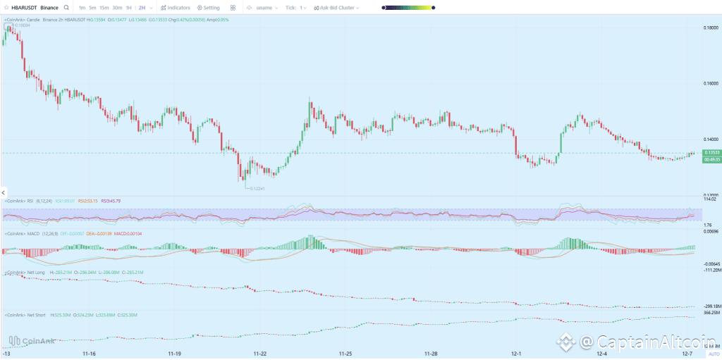 On the RSI panel, HBAR dipped into oversold territory near the November low, then bounced back and is now sitting slightly above the midline. The fast RSI line is hovering in the 50–60 region, which tells you selling momentum has cooled, but there’s no strong overbought signal either. It’s a neutral-to-slightly-constructive read: bears have lost some control, but bulls haven’t taken over.