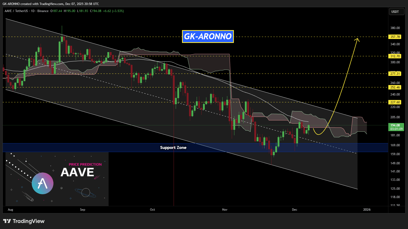#AAVE is moving inside a descending channel on the daily chart. Since it is currently interacting with the Ichimoku cloud and the daily SMA50, you can consider buying a small bag here and another position near the support zone. In case of a breakout above the channel, the potential targets are: