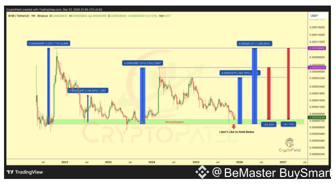 👉 Looking at the chart, this same support level has sparked some impressive runs: a massive 1,237% jump, followed by moves of 148%, 574%, and most recently 382%. Each time SHIB touched this zone, buyers stepped in aggressively. The chart clearly marks this as "Strong Support," with a warning note at the $0.0000060 bottom saying "I don't like to hold below" - showing just how important that floor is. If SHIB breaks upward, resistance levels sit at $0.0000257, $0.0000386, and around $0.0000812.