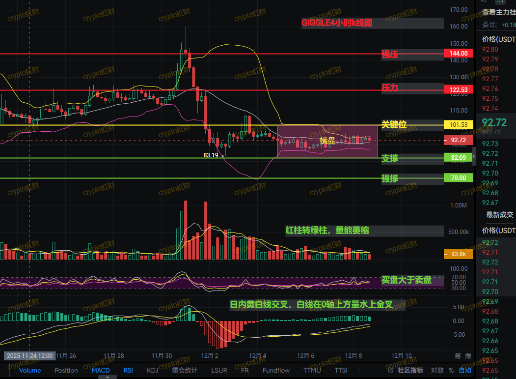 Small-cap coins change rapidly, and once they break below the 82 support, they may decline quickly. So be sure not to be blindly optimistic! GIGGLE is squeezed between the ceiling at 101 and the floor at 82, and has been compressed to the limit. It's like a spring being pushed down, ready to explode with a big market movement at any moment!