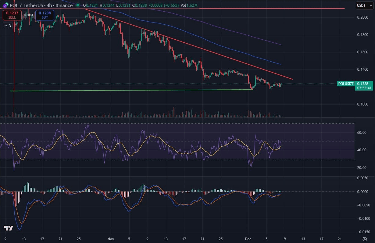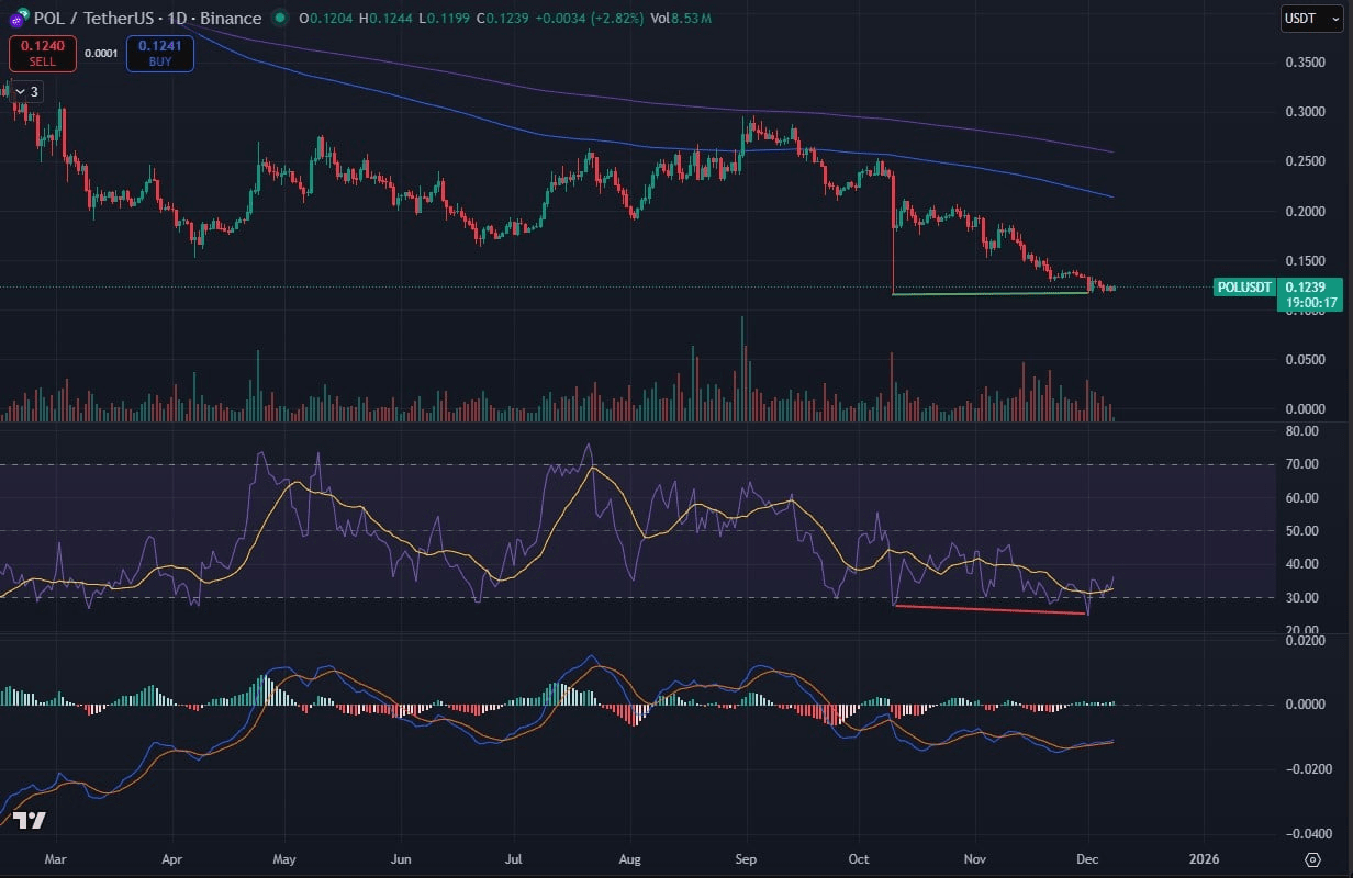 Despite its tough year, POL's price movement shows early signs of stability. On the daily time frame, POL has successfully defended the $0.12 support level, forming a potential bottom and a hidden bullish divergence since the collapse on October 10.