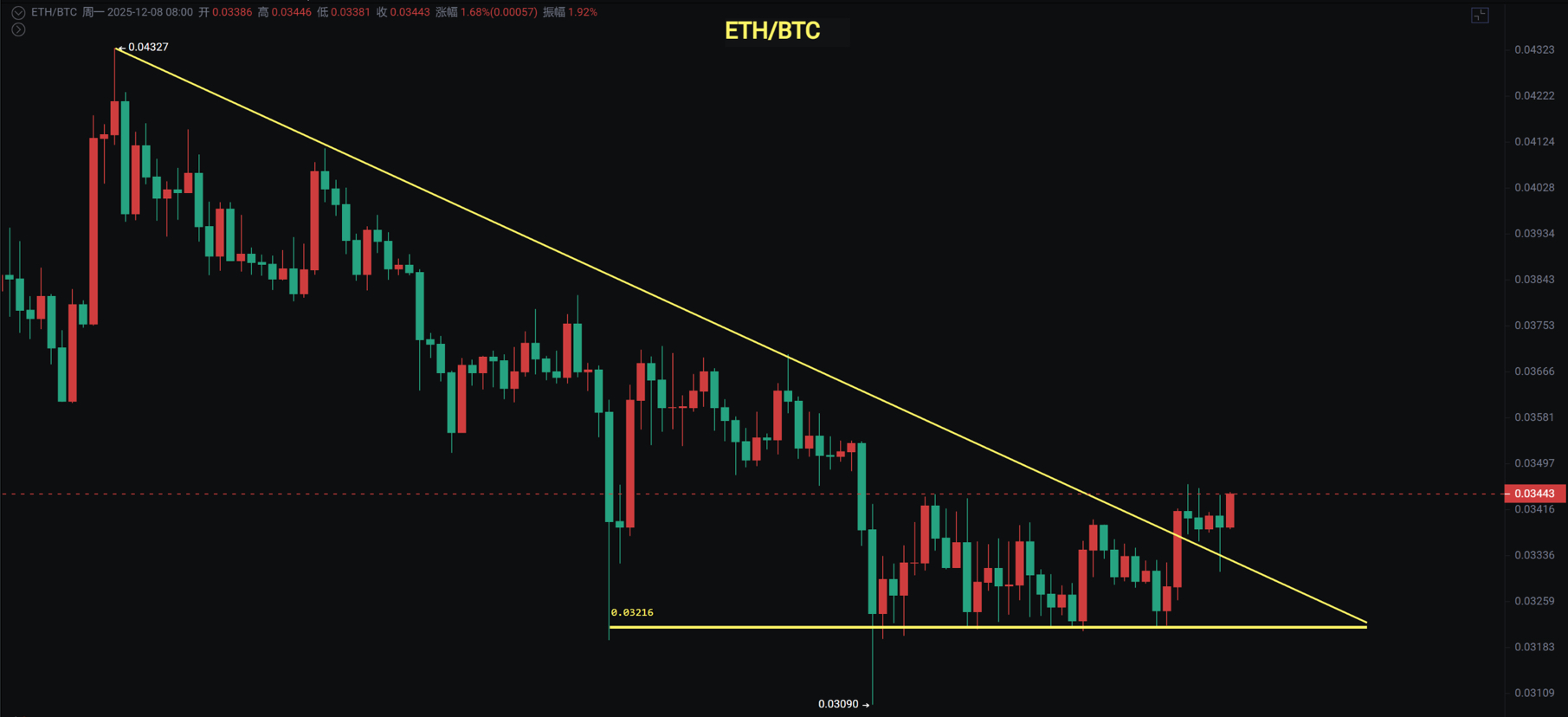 ETH/BTC exchange rate downtrend line breakout, weekly facing rebound B wave, Ethereum and altcoins facing opportunities, can grasp some rebound strong altcoins.
