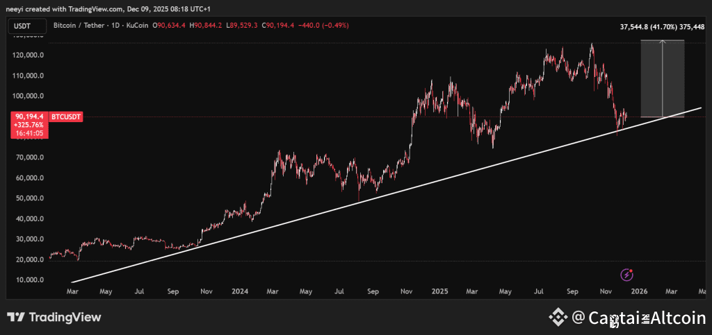 BTC trades near $90,000 and rests on a trendline that has guided the uptrend since early 2023. Every major pullback paused on this line. Each time Bitcoin touched it, BTC price formed a higher low and created the next leg toward fresh highs. The current position mirrors those moments.