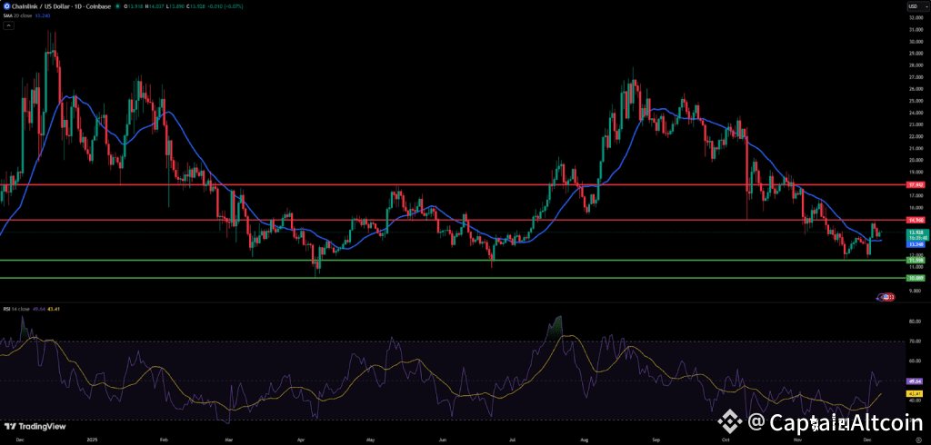Chainlink has been consolidating between $11.50 and $15.00 as of early December 2025. The price has declined by more than 7% over the past month. Nonetheless, the community sentiment toward the altcoin remains strongly bullish. The RSI is around neutral territory on the daily timeframe, leaving room for upside without overbought risks.