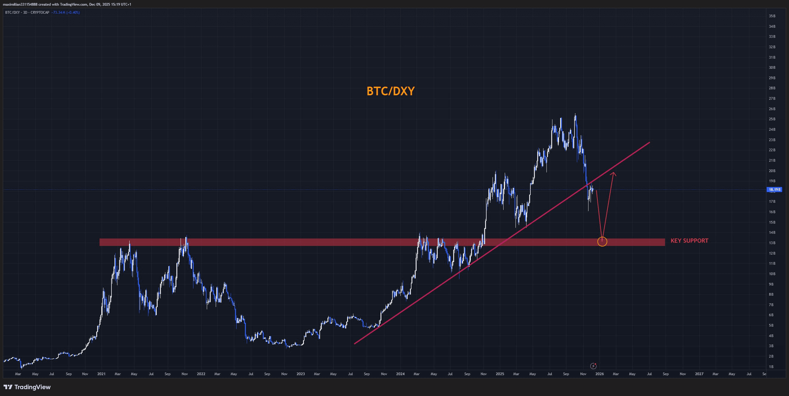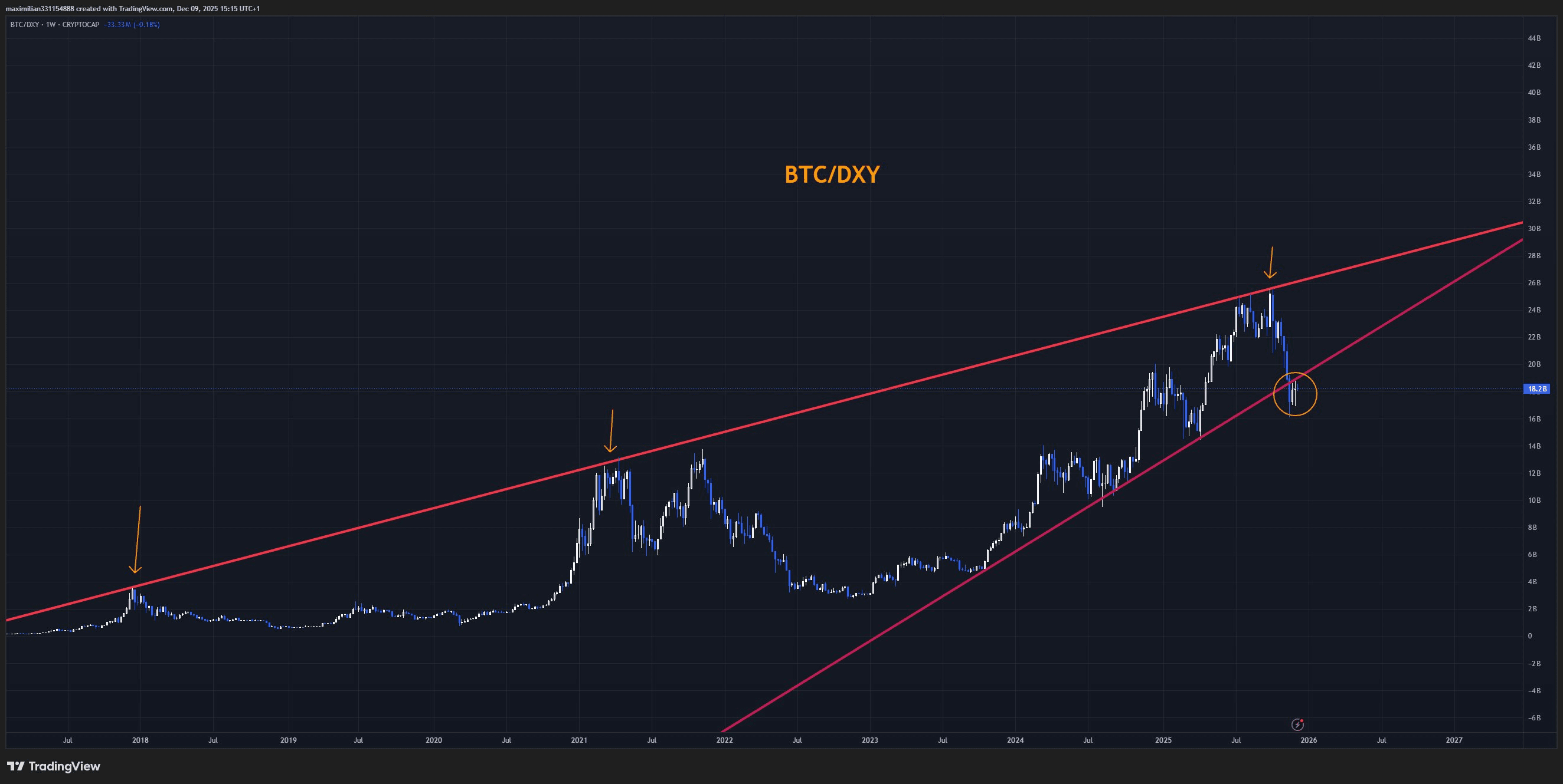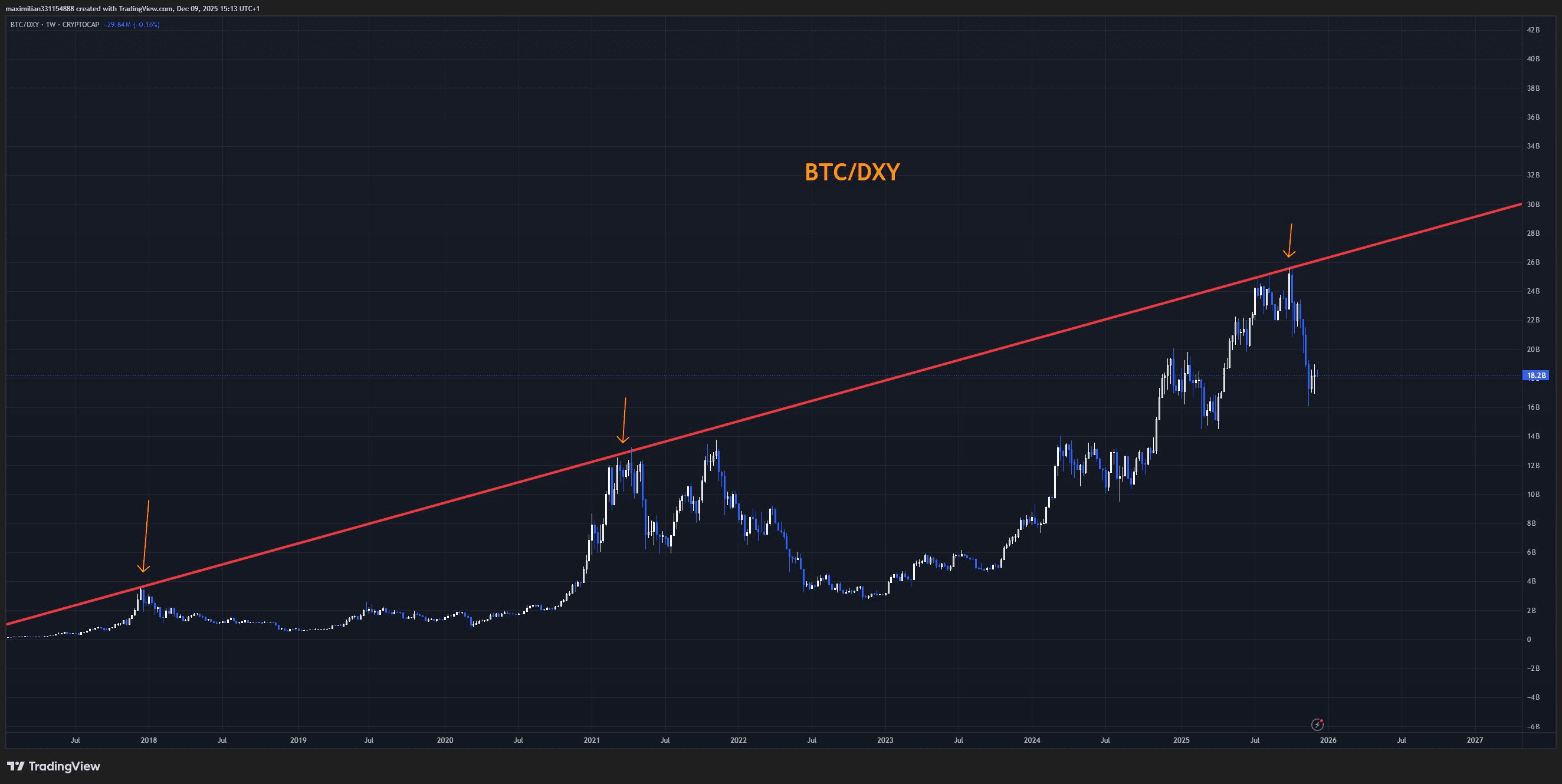 Looking back at the past, BTC/DXY has touched the long-term trendline three times and created significant peaks: in 2017, in 2021, and also the recent peak. Each time it touches the red line, BTC tends to drop sharply. It is like an early warning that few people pay attention to.
