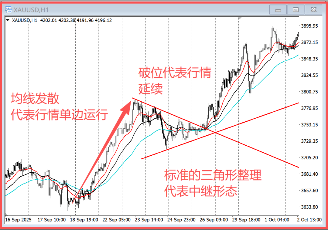 Because the divergence of moving averages is easily recognizable, it represents the running trend of the market; the consolidation triangle represents market continuation, and the two contracting trendlines are also very simple; the breakout represents the continuation of the trend, with clear and unique entry standards.