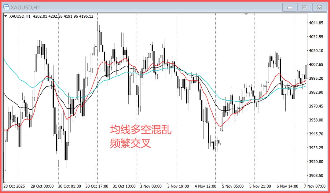 The chart shows the gold 1-hour candlestick chart. In the trend of nearly 8 trading days, the moving averages frequently cross, the direction is chaotic, and the high and low points are unclear, making it difficult to find clear entry, stop-loss, and exit points.