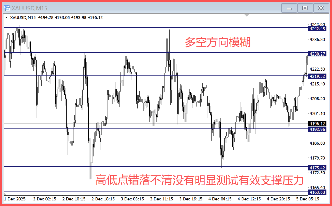 The chart shows the gold 15-minute candlestick chart. At first glance, one cannot find a clear and effective support and resistance position; the high and low points are disordered, and there is no support or resistance that has been continuously tested and confirmed. The long and short directions are very vague.