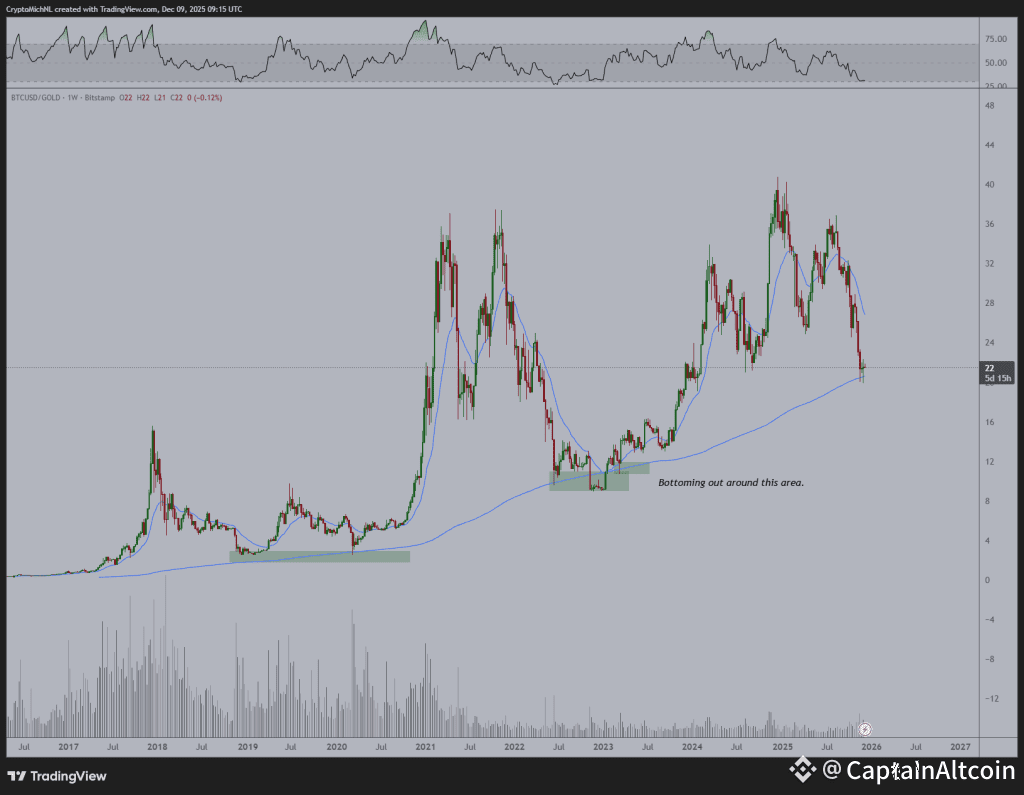 • A first major expansion phase where the ratio climbed, then cooled off into a multi-year consolidation.• A second explosive rally into the 2021 cycle peak, where BTC massively outperformed gold.• The current phase: a long grind lower from those highs back toward the 300-week moving average.