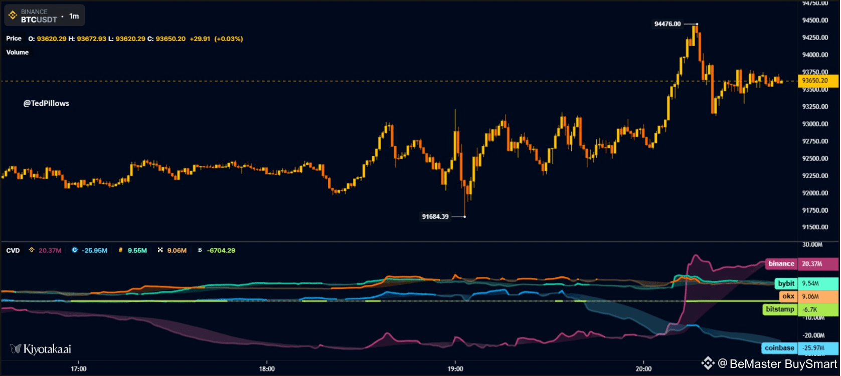๐ The numbers tell the story clearly: Binance's cumulative volume delta climbed to roughly 20.37 million, showing steady accumulation. Coinbase went the other way, dropping to around negative $25.97 million as sellers dominated. OKX and Bybit each pulled in modest inflows near 9 million, while Bitstamp sat slightly negative at about 6,700. The price dipped sharply toward $91,684 before bouncing back to $94,476, suggesting these uneven flows were driving the volatility.