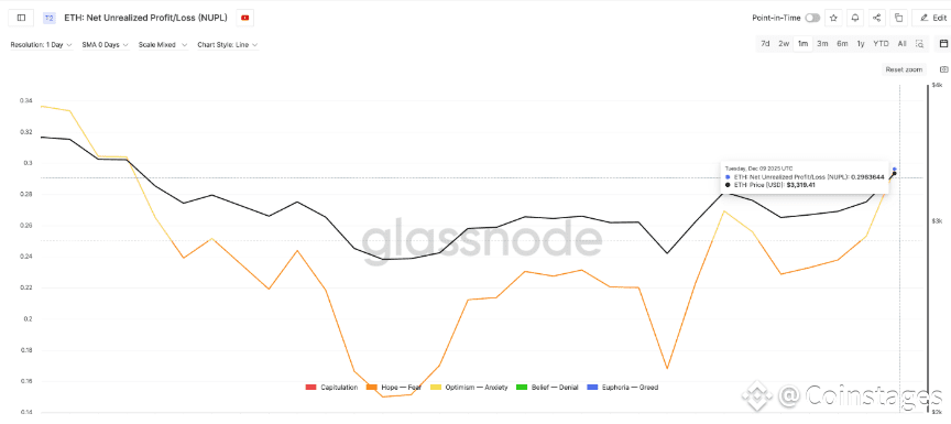 NUPL Anxiety Zone: Ethereum’s NUPL (Net Unrealized Profit/Loss) has climbed to 0.296, entering the Optimism–Anxiety zone. This level, the highest since early November, signals that a large number of holders are sitting on significant unrealized gains.