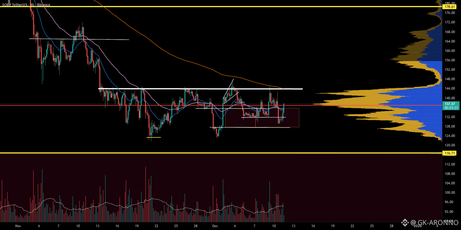 The key level remains unchanged: SOL needs a clean breakout above the range high to open up that much larger volume gap toward the mid-140s. Until then, this is a consolidation with tightening compression.