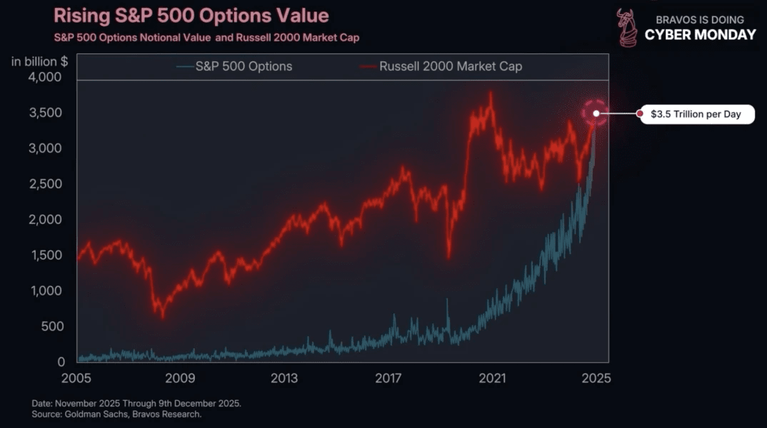 In their analysis, Bravos Research draws attention to the sharp increase in speculative activity. Daily trading volume in options on the American market reached $3.5 trillion. Such a volume is comparable to the total capitalization of all companies in the Russell 2000 index and indicates extensive use of short-term and high-risk strategies.